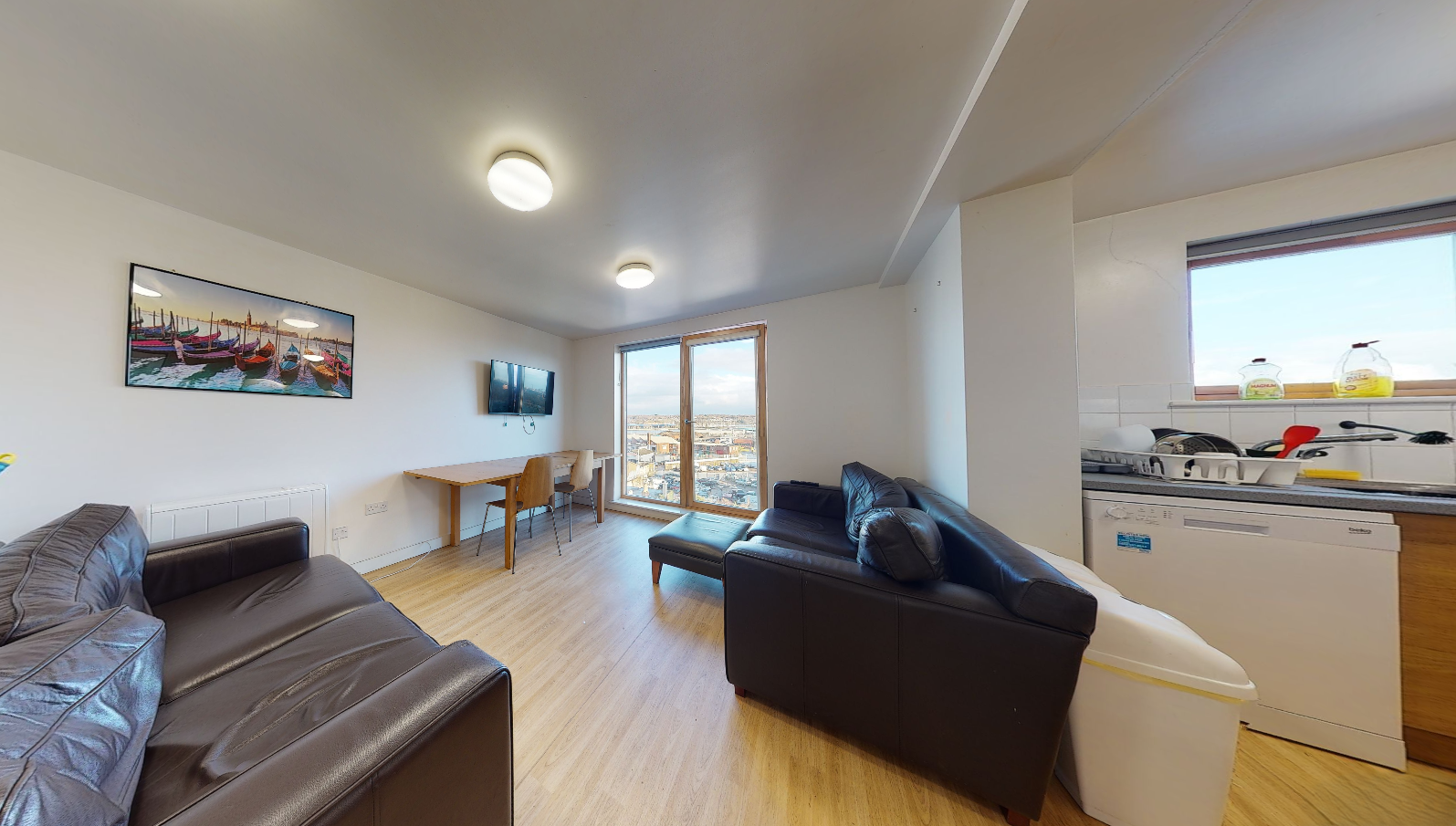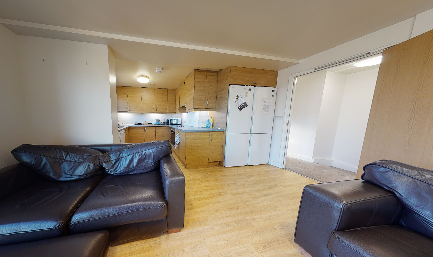 Open plan kitchen/living space with sofas and dining set