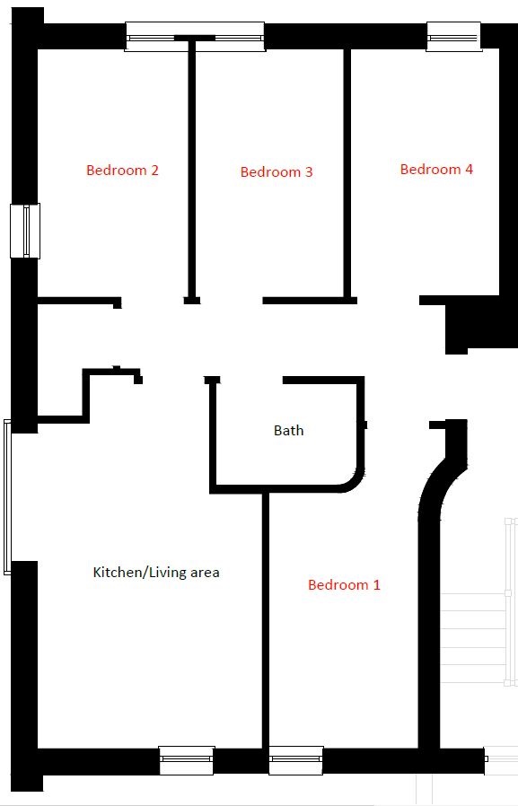 This 4-bedroom flat is on the 2nd floor, and benefits from a Juliet balcony in an open plan kitchen / lounge.